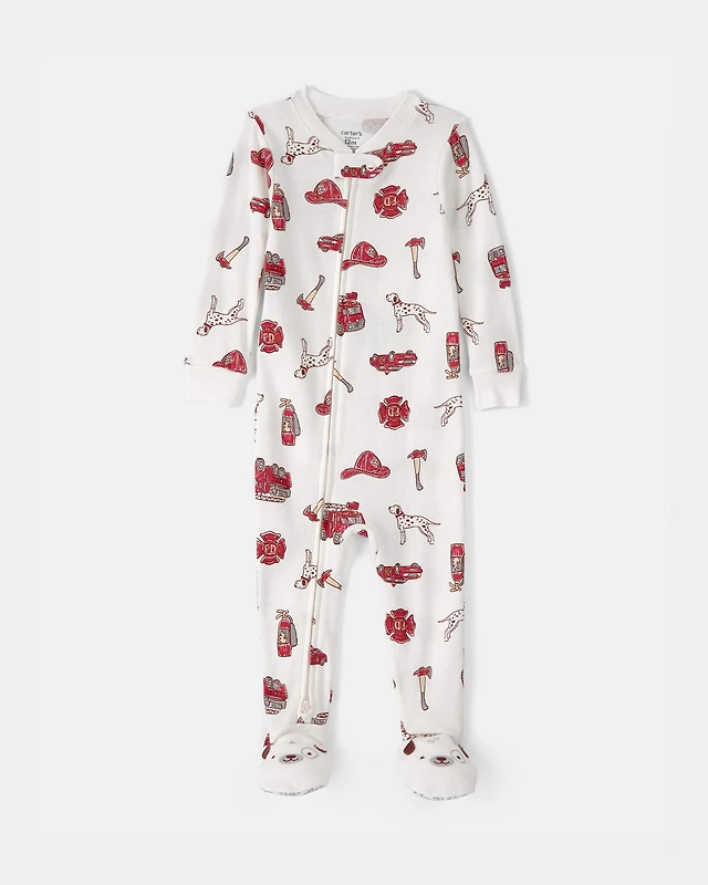 Toddler Boy Firetruck 100% Cotton Snug Fit 1-Piece Pajama Set - White