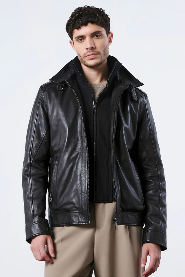 MALCOM LEATHER WOOL BONDED BOMBER WITH SHIRT COLLAR
