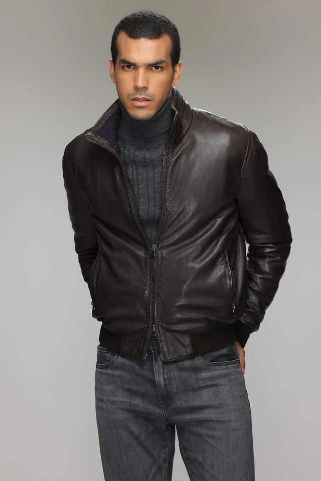 DION Genuine Shrunken Leather Bomber Jacket