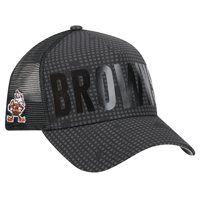 Men's New Era Black Cleveland Browns Throwback Midnight Ink Tonal Text A-Frame Trucker 9FORTY Adjustable Hat