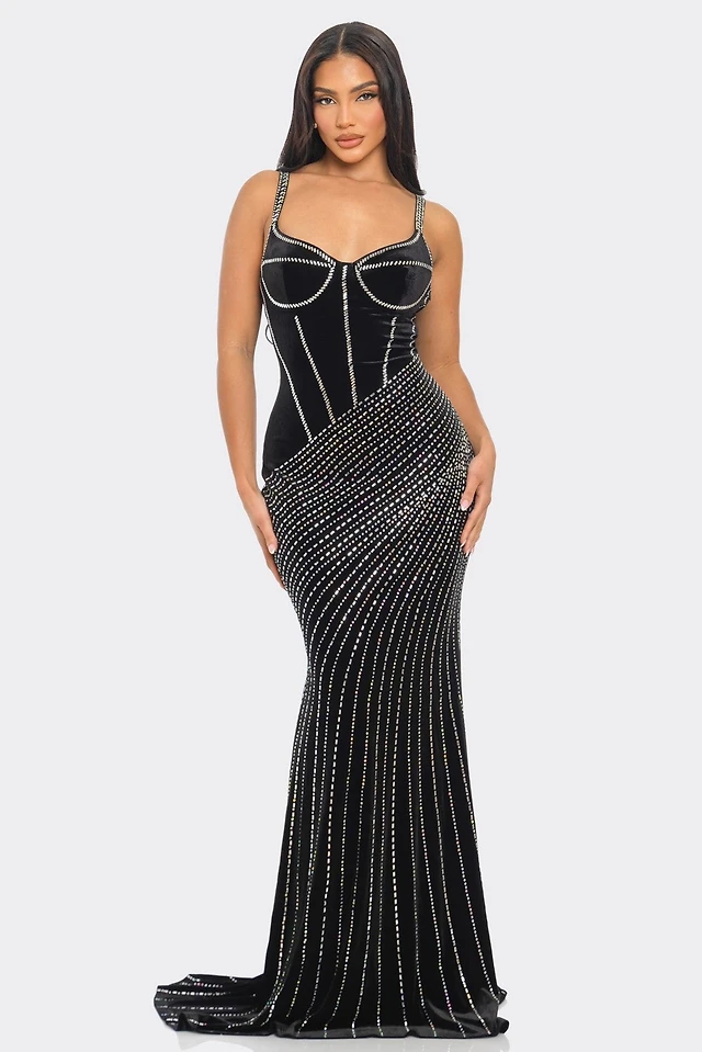 SATIN MICRO CRYSTAL FITTED BEADED GOWN