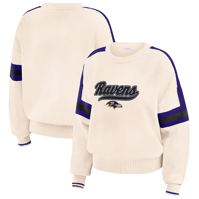 Women's WEAR by Erin Andrews Cream Baltimore Ravens Racing Crew V-Neck Sweatshirt