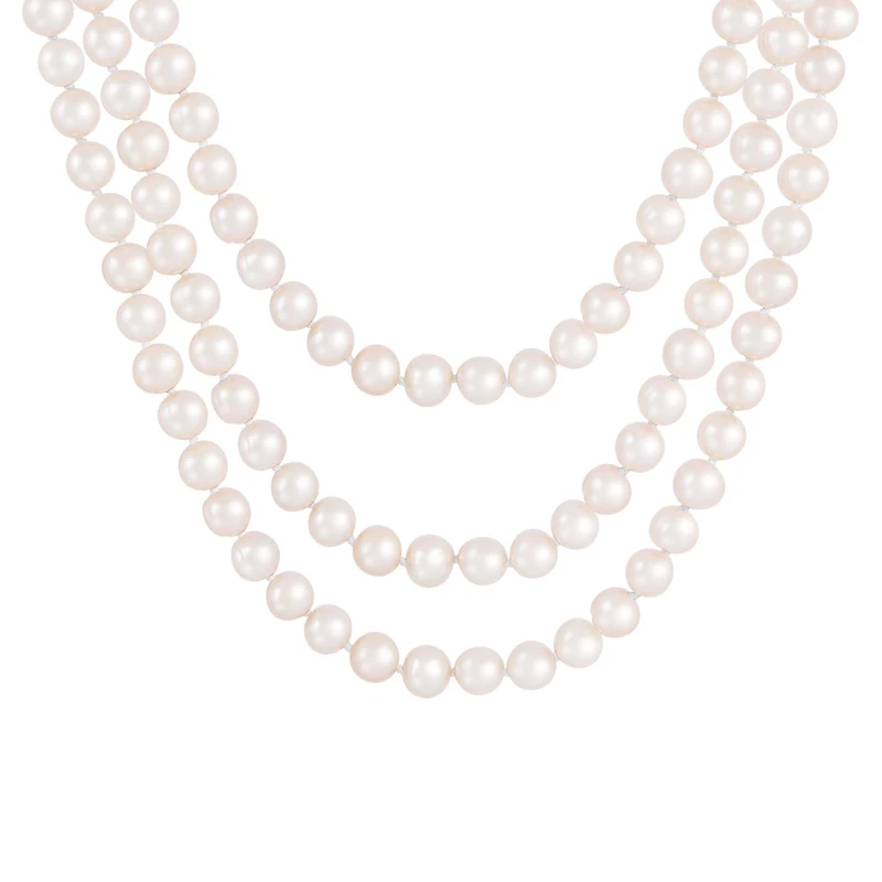 A 100-inch endless strand of 7-8mm white freshwater pearls creates a stunning and versatile accessory. This necklace offers flexibility in styling, allowing for various ways to wear it—doubled, layered, or knotted. The elegance of freshwater pearls adds a touch of timeless sophistication to any outfit, making it a statement piece for both formal events and everyday wear.
