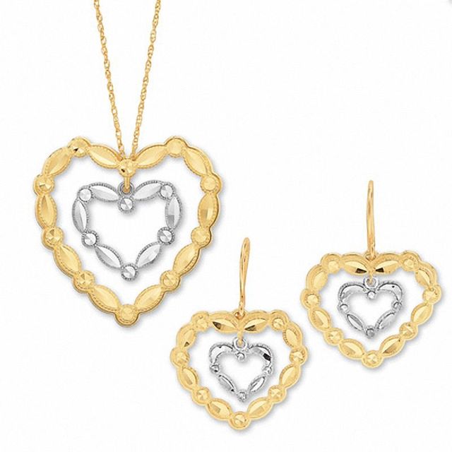 Curved lines of 10K white and yellow gold overlap and twine around each other like sparkling strands of ribbon, forming a graceful, symmetrical pendant and drop earring set. With one half polished, one half diamond-cut, the spirals glint and dance with each step you take. The pendant hangs on an 18.0-inch rope chain with spring-ring clasp, and the earrings feature a post back.