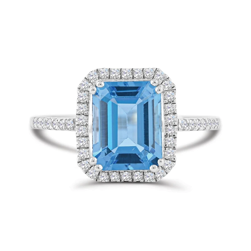 This fantastic ring is made with an octagon-cut swiss-blue topaz encircled with round-cut white zircons set in lustrous white gold. Add a touch of glamour to your outfit with this beautiful ring.