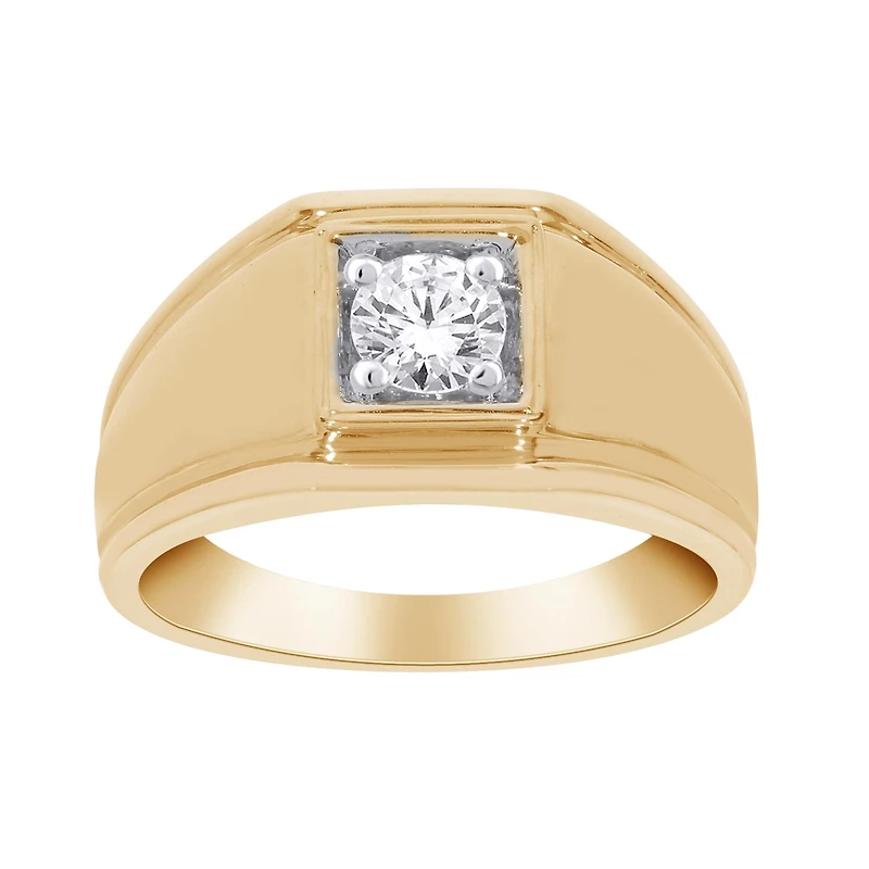 Crafted in lustrous 10K yellow gold, this solitaire ring features a shimmering round-brilliant 0.47 carat diamond. Enhanced with a high polish finish, this stunning diamond ring makes a bold addition to any jewellery collection and is the perfect wedding band.