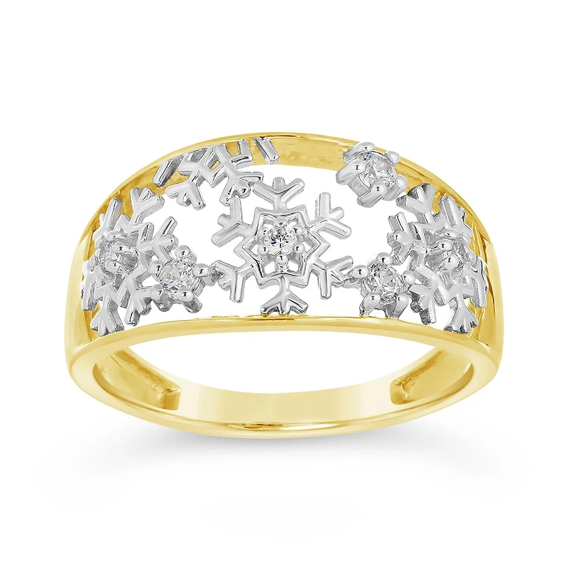 These icy-cold snowflakes will warm even the coldest hearts! Crafted in lustrous yellow gold, this ring is adorned with festive white gold flakes set with shimmering cubic zirconia's. Buy this precious piece for yourself or for that special person in your life.