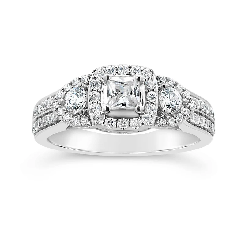 Indulge in the enchanting allure of the 14K White Gold 1.00CTW Diamond Three-Stone Ring, a masterpiece that combines sophistication and brilliance. At the heart of this ring, a princess-cut diamond takes center stage, radiating timeless elegance. Flanked by two round diamonds on either side, each encircled by delicate halos, the design creates a captivating symphony of shapes and sparkle. The 1.00 carat total diamond weight adds a touch of opulence, making this ring a symbol of enduring love and commitment. Crafted in lustrous 14K white gold, the setting enhances the beauty of each diamond, ensuring this ring is not just a piece of jewellery but a statement of refined taste and grace. Celebrate life's special moments with a ring that captures the essence of everlasting beauty.