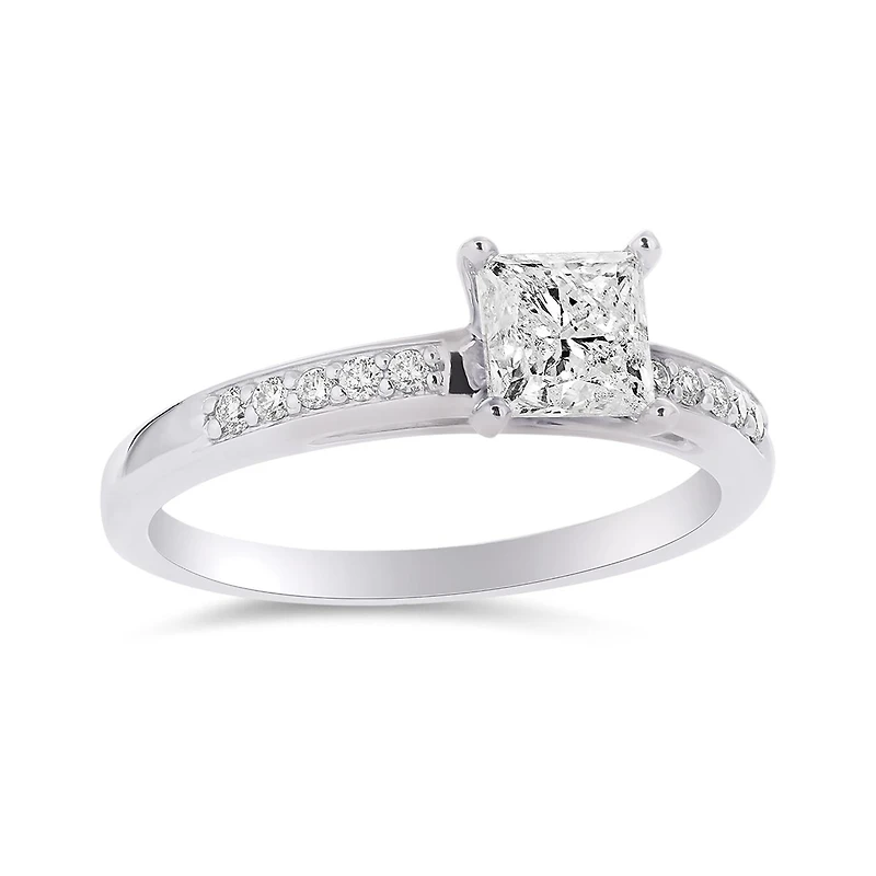 Make her feel like royalty with this chic Princess cut ring. Crafted in 14-karat white gold and completed with diamond set shoulders, this diamond ring is sure to rule.