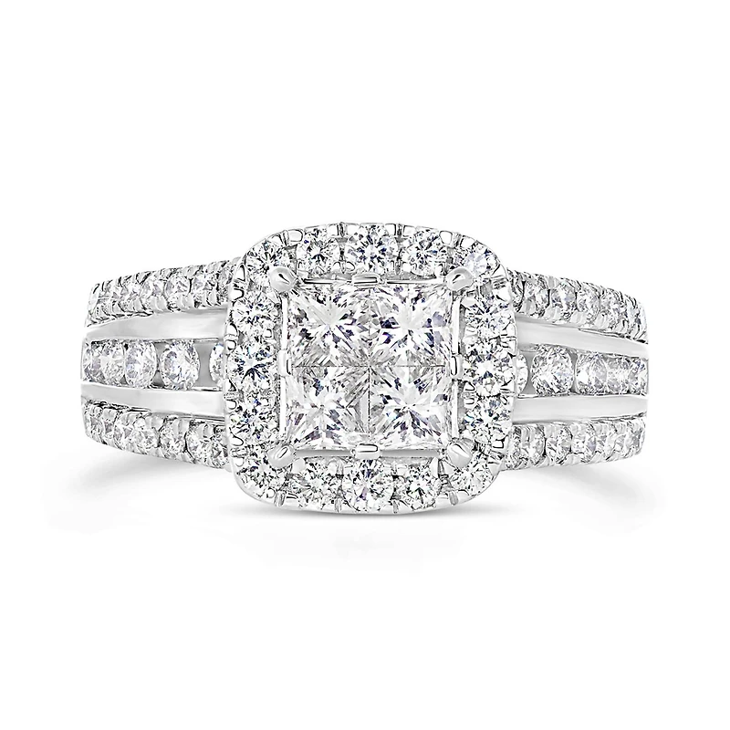 A true show-stopper, this 2.00ctw diamond bridal ring was designed to wow. Featuring a seamless princess cut diamond quartet at its centre, a sparkling halo and three rows of diamonds along the band, this ring will sparkle for a lifetime of love.