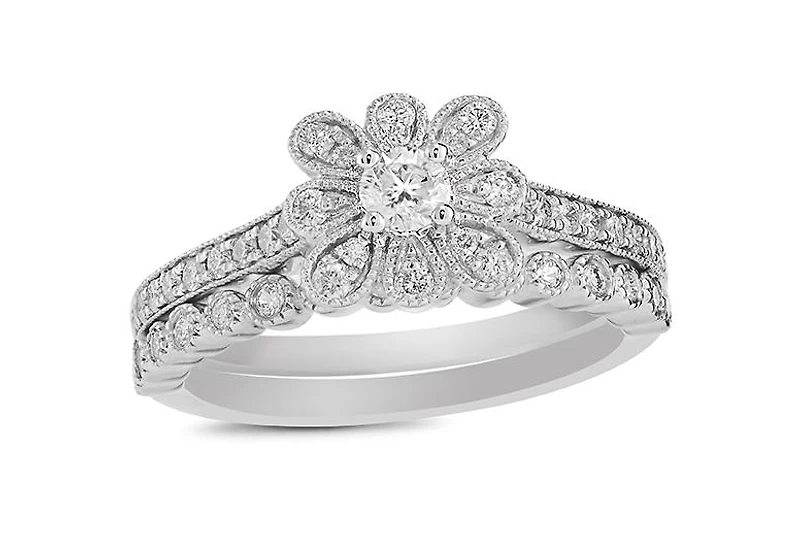 Love blossoms with this romantic 14k white gold bridal set. A beautiful round diamond shines as the centrepiece bordered by a cluster of diamond petals, as additional diamonds cascade along the side of the band. To complete the elegant look, a delicate diamond ring to signify your love to one another.