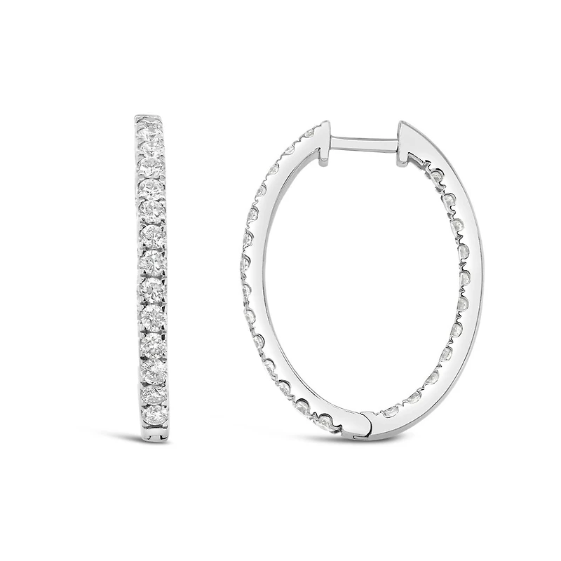 Crafted in 14kt white gold, these inside out Lab Grown diamond hoop earrings sparkle form every angle. Adorned with 2.00ctw of round brilliant cut lab grown diamonds, the hoop earrings are secure with a hinged click post. New Brilliance Lab Grown Diamonds- Lab grown diamonds possess all physical, optical and chemical characteristics of a natural mined diamond. They are a cost effective option without compromising the size and quality of the diamond. With normal day to day wear, your lab grown diamond will provide a lifetime of beauty.
