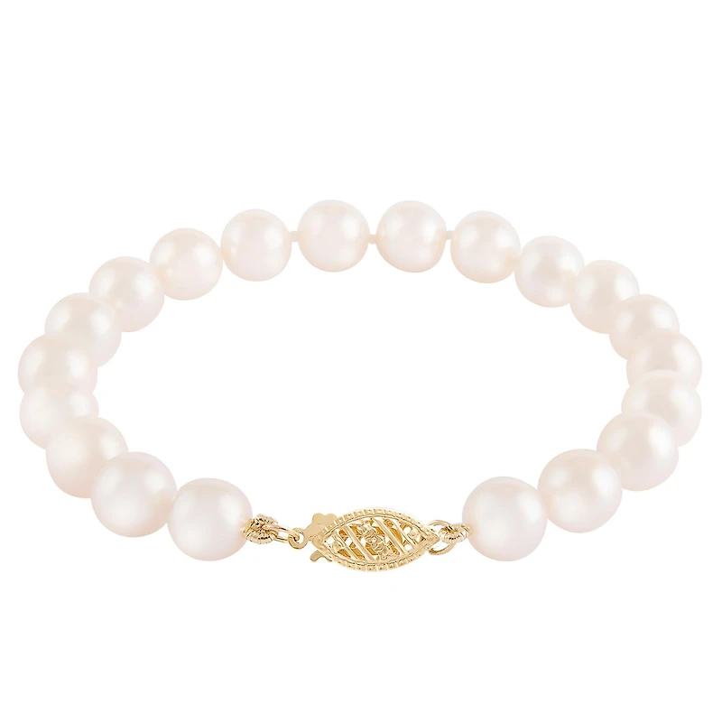 Stand out from the crowd with this gorgeous Akoya pearl bracelet with 14k yellow gold clasp, featuring lustrous 7-8MM white Akoya pearls. This classic bracelet is sure to become a favourite in your jewellery collection.