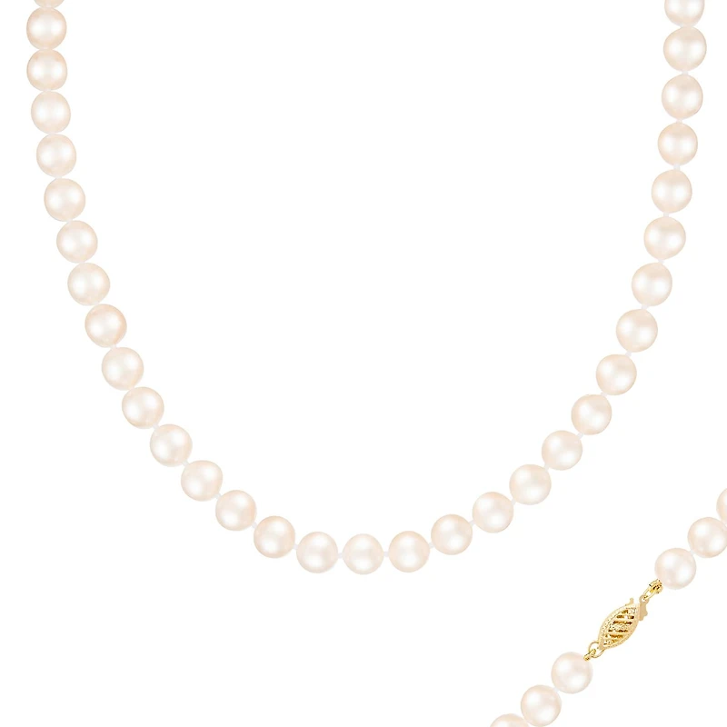 7-8MM white freshwater pearls are beautifully strung into a timeless 32 inch strand with a 14K yellow gold pearl clasp. This classic piece is sure to become a favourite in your jewellery collection.