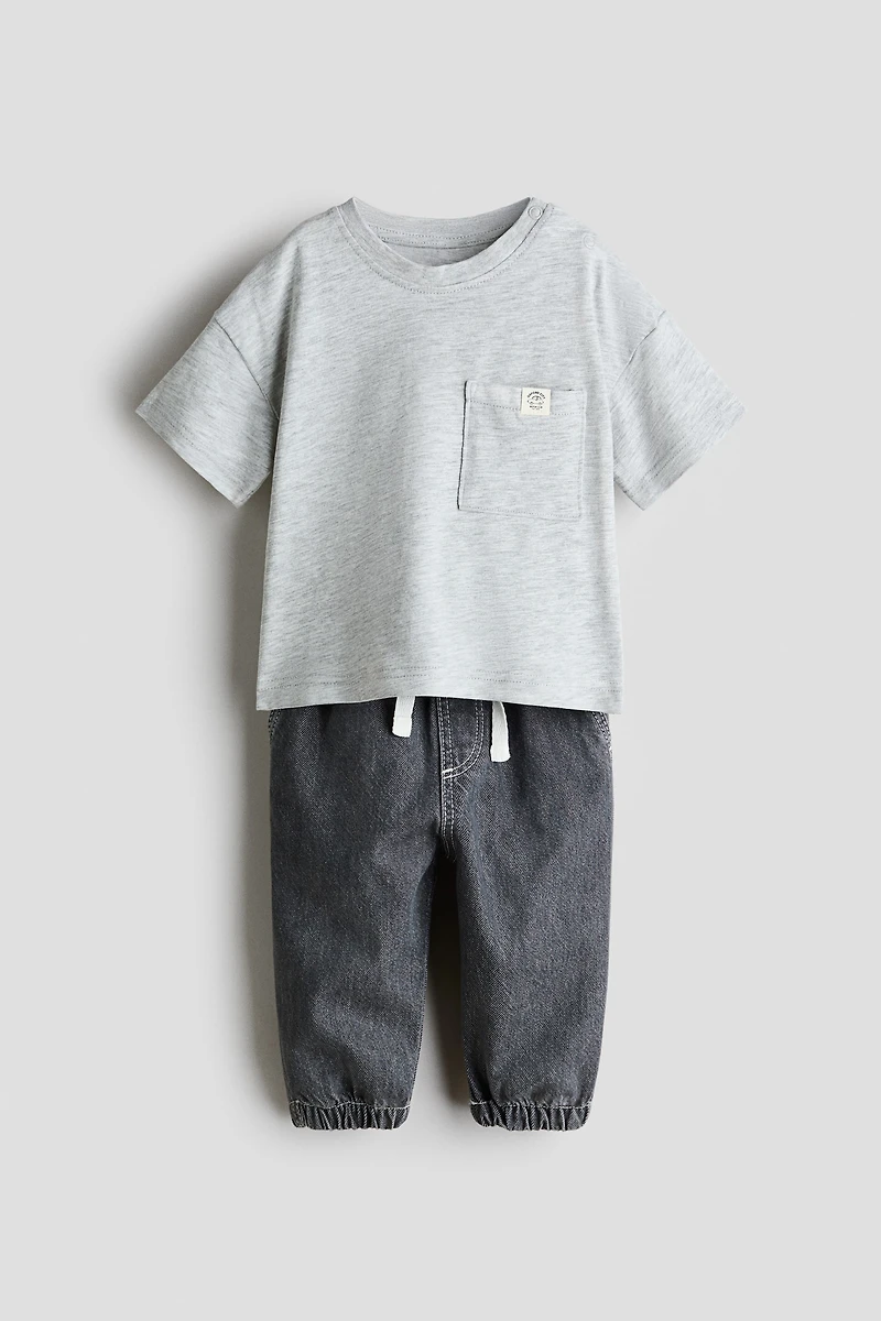 Set with a T-shirt in soft cotton jersey and joggers in soft denim made from a cotton and lyocell blend. T-shirt with a ribbed round neck, snap fasteners on one side of neck (sizes 2–4Y without snap fasteners), an open chest pocket, and dropped shoulders. Joggers with an elasticized, drawstring waistband, mock fly, decorative side pockets, and covered elastic at hems.