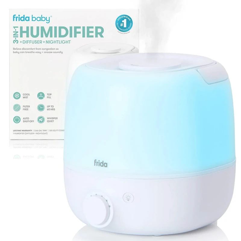 The Frida Baby 3-in-1 Baby Humidifier, Nightlight, and Diffuser is the ultimate solution for creating a serene nursery atmosphere. Specifically designed for babies and toddlers (but great for adults too), this cool mist humidifier and top fill humidifier ensures optimal moisture levels, promoting comfortable breathing and better sleep. With its gentle night light feature, it provides a soothing ambiance perfect for bedtime routines with 60 hours of fill time. The sleek design, makes it easy on the eyes. Plus, it doubles as a versatile diffuser, allowing you to customize the atmosphere with your favorite essential oils. Invest in your baby's well-being with this multifunctional and stylish addition to any nursery. Features: