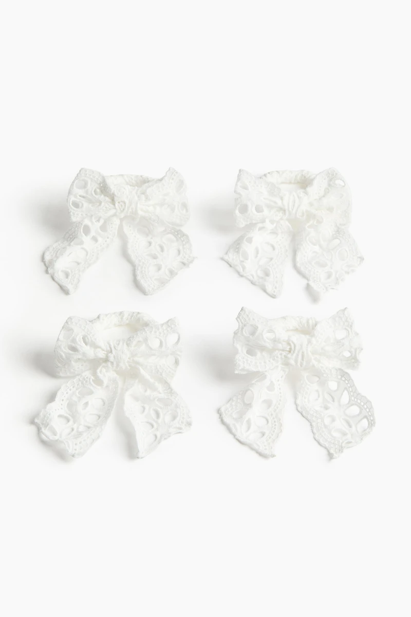 Napkin rings covered in eyelet-embroidered woven cotton with a bow detail at front.