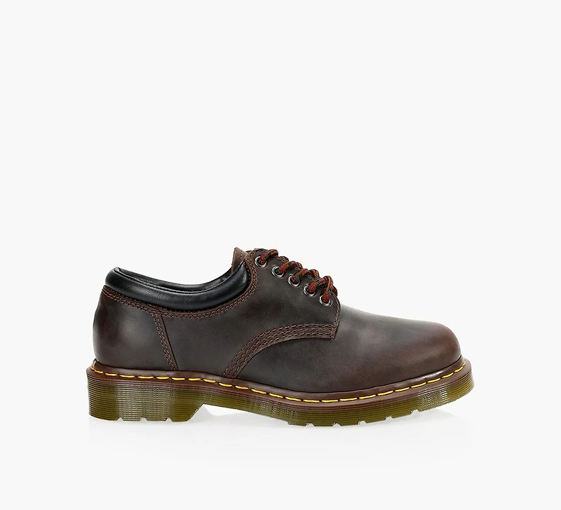 Polished 5-eye derbys featuring signature welt stitching in yellow, padded collar for comfort and tonal Airwair treaded rubber platform sole. Lace-up closure and polished hardware.