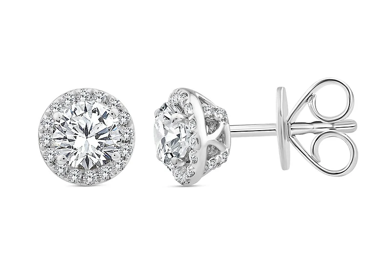 A brilliant fusion of artistry and elegance, these lab grown diamond stud earrings feature mesmerizing 100-facet stones that reveal a hidden star within their sparkle. Framed by a delicate halo in 14K white gold, this 1.37CTW pair radiates a luminous and captivating beauty.