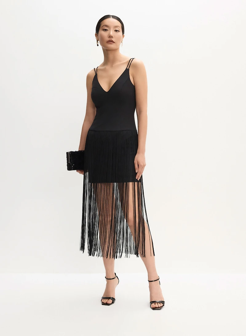 Looking for a dress that will make you stand out from the crowd? We've got you covered! Slip into this stunning fringe detail dress with a flattering V-neck and fringe overlay.