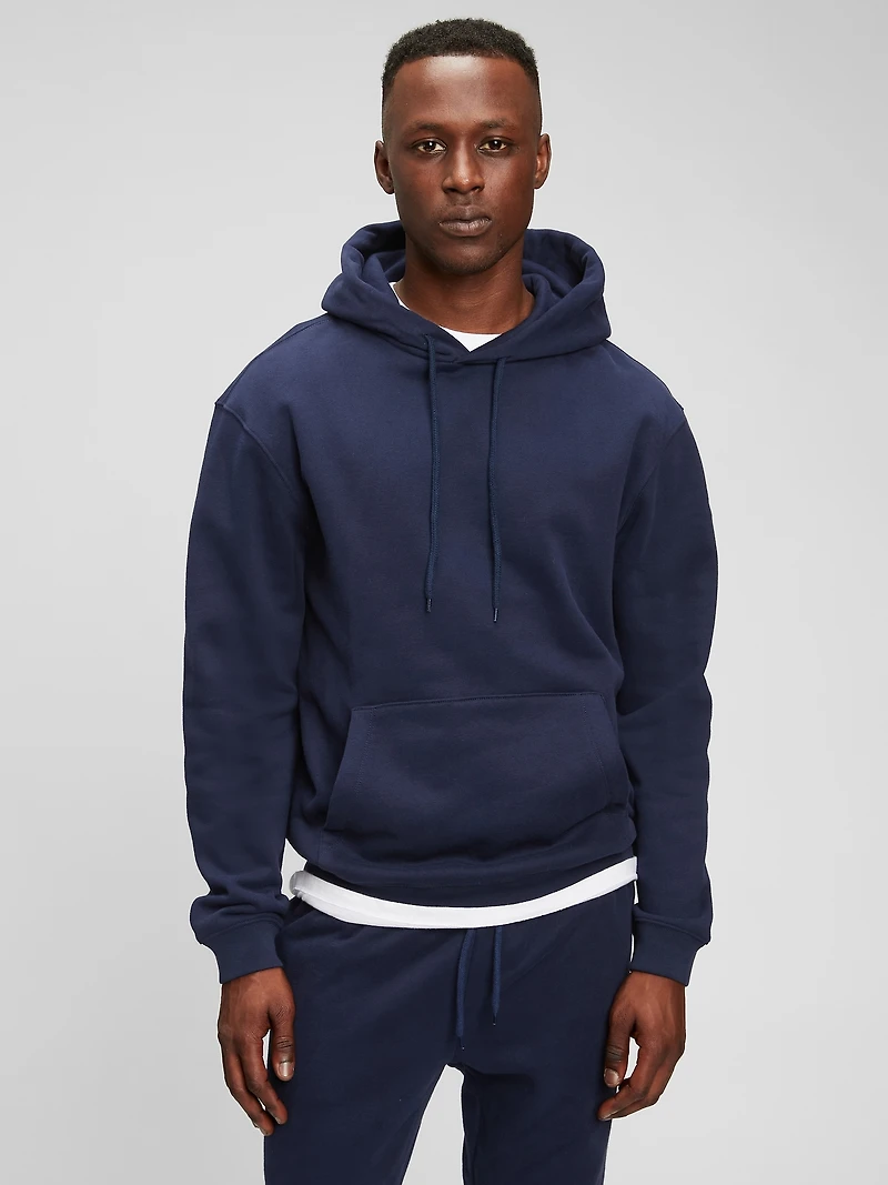 Soft cotton-blend fleece relaxed hoodie. Hooded neckline with drawcords. Long sleeves with banded cuffs. Front kanga pocket. Banded hem. Made with 23% recycled polyester. Compared to virgin materials, using recycled materials helps reduce resource use and waste. Explore our GapSweats Guide. Cotton 77% Recycled Polyester 23%