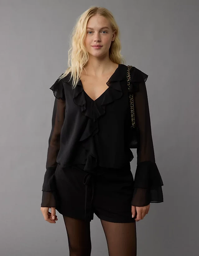 AE Long-Sleeve Chiffon Ruffle Blouse