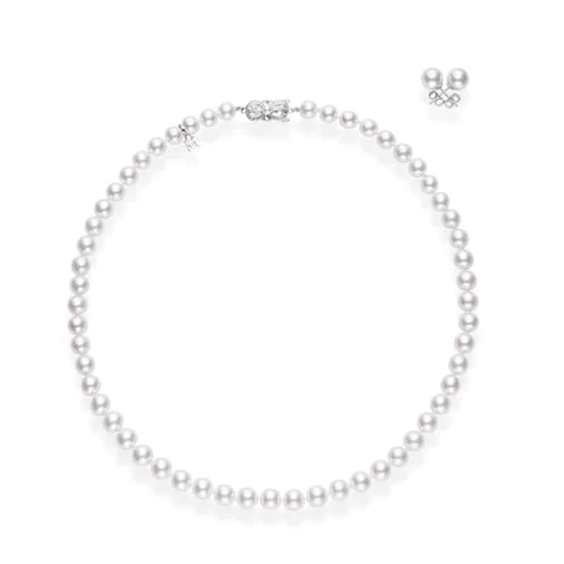 Each of Mikimoto's pearl necklaces are a work of art born from the mystery of the sea. The creation of these necklaces requires incredible skill, judgment, and craftsmanship. The journey begins with a rigorous selection process, culling the very best quality pearls. This 18' Akoya cultured pearl strand features 7x6mm Akoya cultured pearls with a Mikimoto signature clasp in 18K white gold. Together with the matching studs, this is an ideal look or gift for any occasion.Mikimoto's Akoya Cultured Pearls are one of the most sought-after in the world and are currently available in limited quantities.