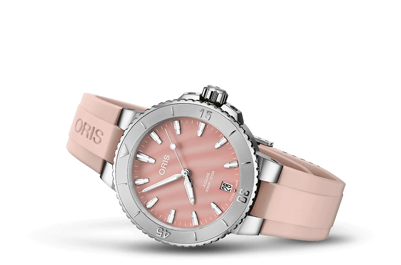 The blush pink Aquis Date diver's watch is a standout with its high contrast dial. The dial, crafted from mother of pearl, shimmers like the sunset on water, adding elegance to its high-performance profile. This watch, with its familiar tapered silhouette, is a unique piece in the Aquis collection.
