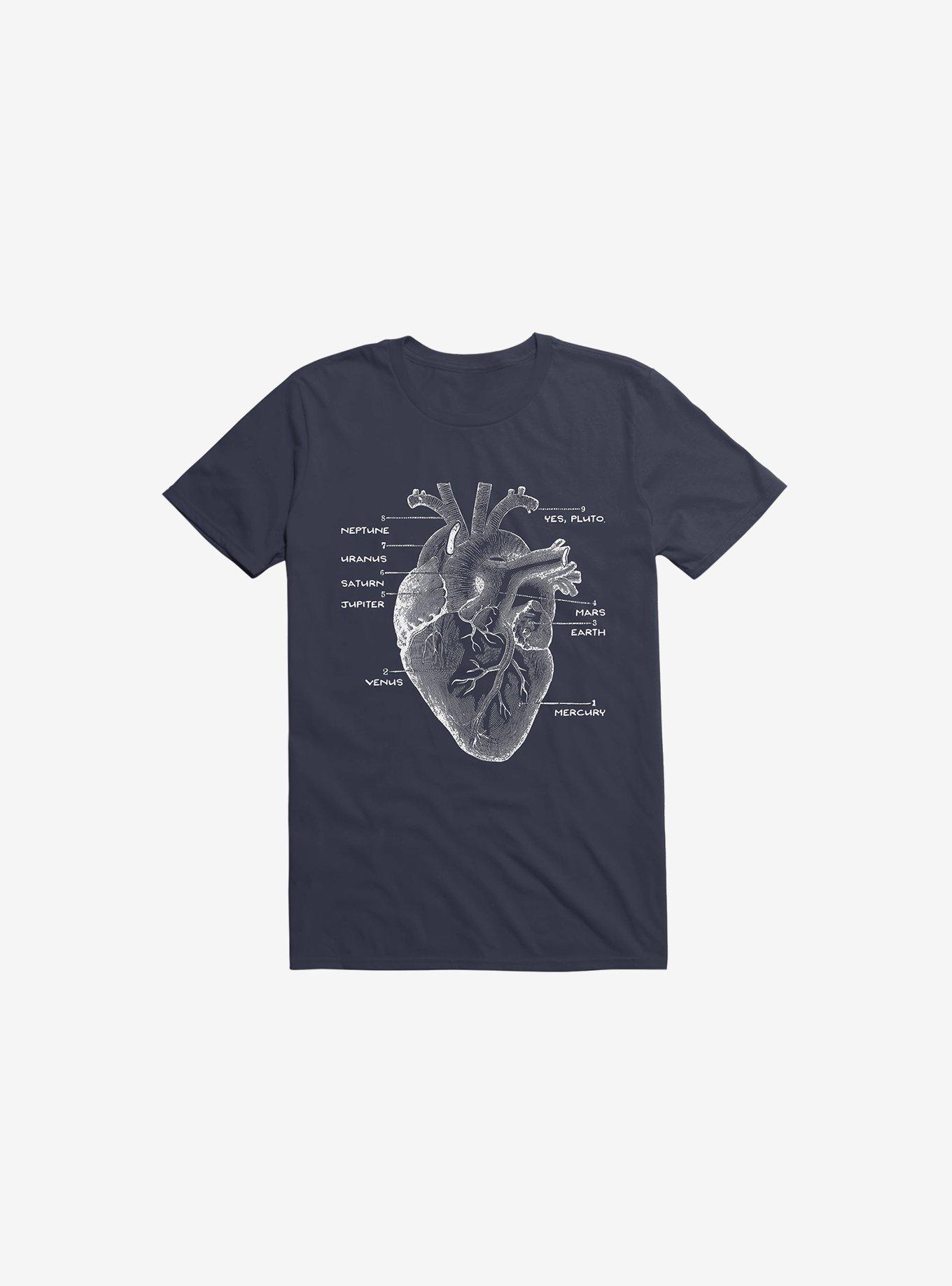 From circulatory system to solar system. This lightweight navy blue graphic tee has a heart diagram featuring a list of our galaxy's planets: Mercury, Venus, Earth, Mars, Jupiter, Saturn, Uranus, Neptune... and yes, Pluto. Officially licensed art from Tobe Fonseca.