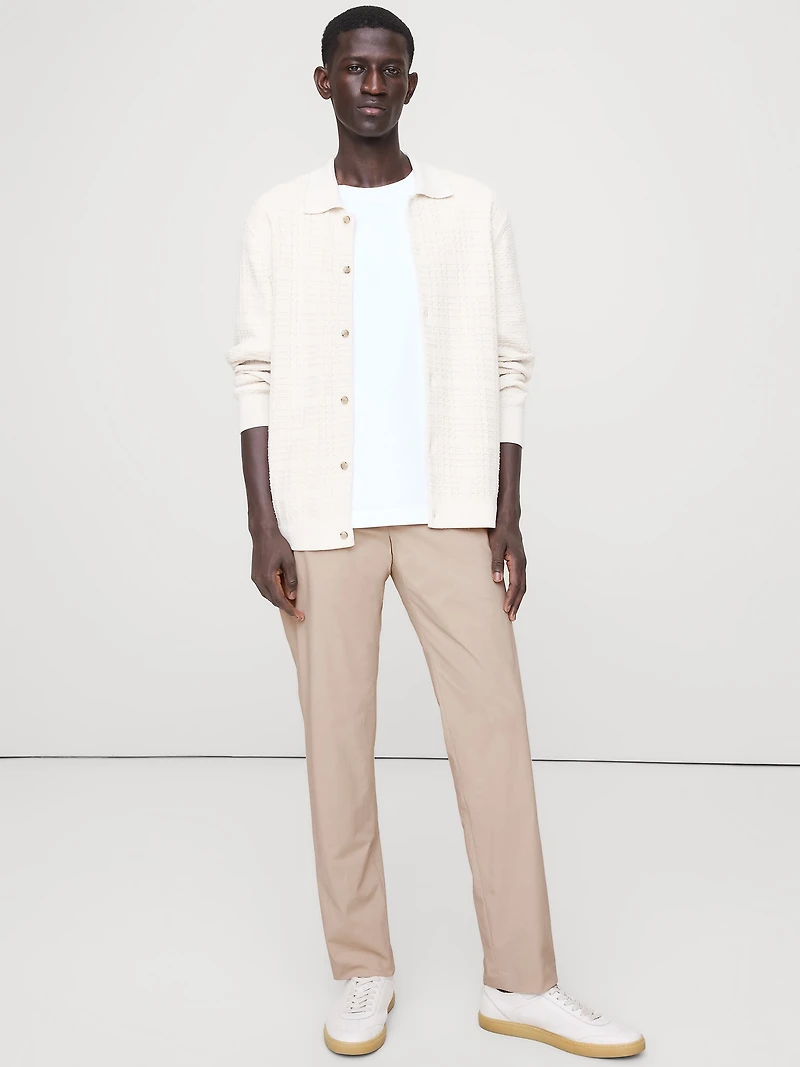 If a suit could be an overachiever—this lightweight pant does the most thanks to a dressed up fabric that's also breathable, stretchy, and machine-washable. Plus, we added elastic at the back waistband for a custom fit. Athletic Tapered Fit: Designed for those who like more room through the seat and thigh. Mid-rise, tapered leg. Zip fly with button closure. Belt loops. Hidden elastic at back waist for a custom fit. Front and back pockets. Unlined.