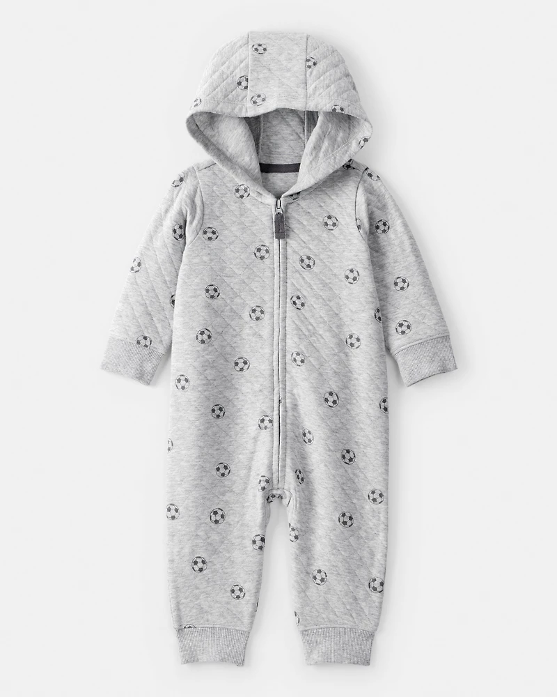 Baby Boy Soccer Quilted Long-Sleeve Hooded Jumpsuit - Black