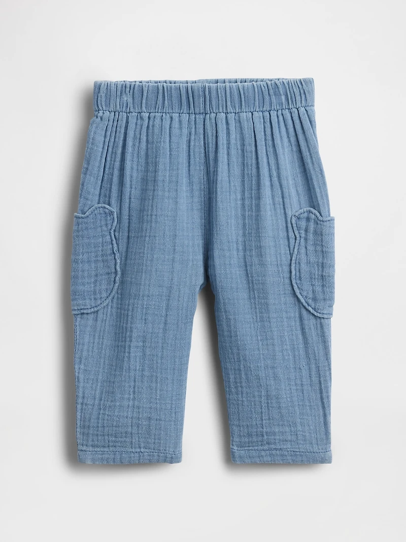 Soft cotton gauze pants. Elasticized waist. Brannan Bear patch pockets at sides. This product was made in a factory that invests in gender equity and women’s empowerment through RISE. Learn more at.gapinc. com/equity .