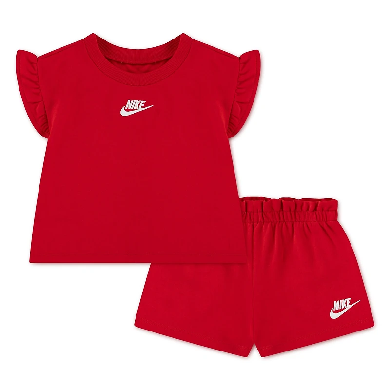 Made of lightweight, soft baby French terry, this 2-piece set from Nike is warm weather cozy. The top has a relaxed fit, tagless crewneck, and a boxy cut that creates a cropped look. The shorts have a comfy, stretch paper bag waist for a unique, laid-back look little ones can play freely in.