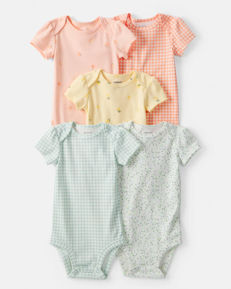 - 5-pack of short-sleeve bodysuits featuring cheerful floral, gingham, and polka dot prints for vibrant everyday wear