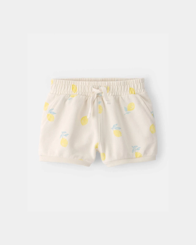 Meet the perfect summer staple: the Baby Girl French Terry Shorts. Designed with comfort in mind, these ivory shorts feature a delightful lemon print that adds a splash of fun to any casual outing. Made from soft, carbonized French terry, they offer breathability and stretch for all-day play. The thoughtful side pockets are perfect for tiny treasures, while the non-functional drawstring adds a stylish touch without the fuss. Easy to slip on and off, these shorts make dressing a breeze for busy parents. Trust in the quality that Carter's is known for, and let your little one shine in style.