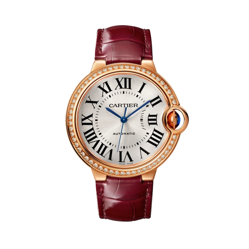 Floating like a balloon and as blue as the cabochon safely nestled in its side, the Ballon Bleu watch by Cartier adds a dash of elegance to male and female wrists alike. Roman numerals are guided on their path by a deep blue winding mechanism. With the convex curves of the case, guilloché dial, sword-shaped hands, and polished or satin-finish links of the bracelet...the Ballon Bleu watch by Cartier floats through the world of Cartier watchmaking. Ballon Bleu de Cartier watch, 36 mm, mechanical movement with automatic winding. Rose gold 750/1000 case set with 54 brilliant-cut diamonds totaling 0.79 carats. Fluted crown set with a sapphire cabochon. Silvered sunray-brushed dial Blued-steel sword-shaped hands. Sapphire crystal. Burgundy alligator leather strap, rose gold 750/1000 ardillon buckle. Case thickness: 12.10 mm. Water-resistant to 3 bar (approx. 30 meters).