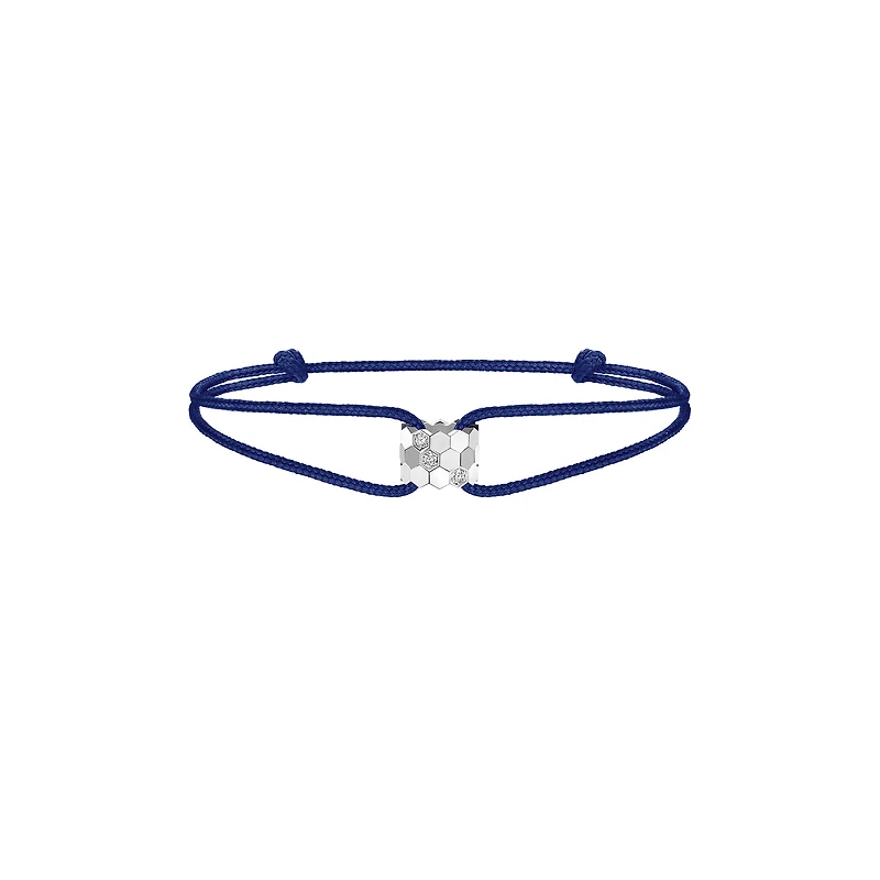 In a radiant echo of the Maison’s past as a goldsmith, mirror-polished white gold and diamond honeycombs capture and diffuse light in a unique way, casting luminous sparkles onto the skin. Reminiscent of the accumulation of iconic Bee de Chaumet rings, this elegant piece features a Chaumet blue cord that fits perfectly around the wrist.