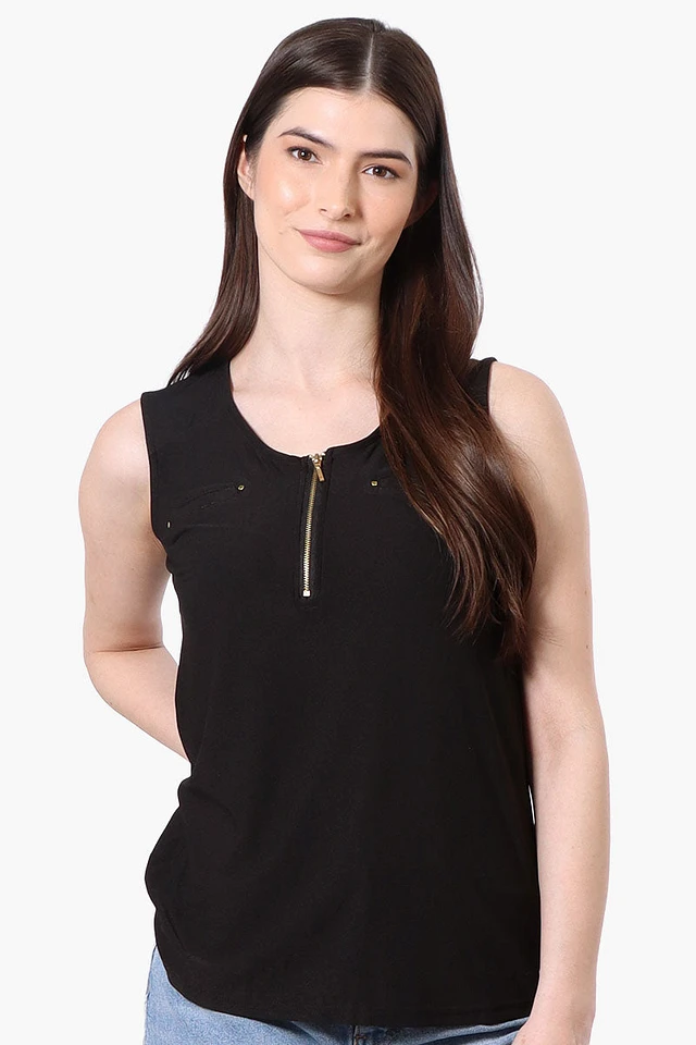 Beechers Brook Leaf Print Cinched Collar Tank Top - Black