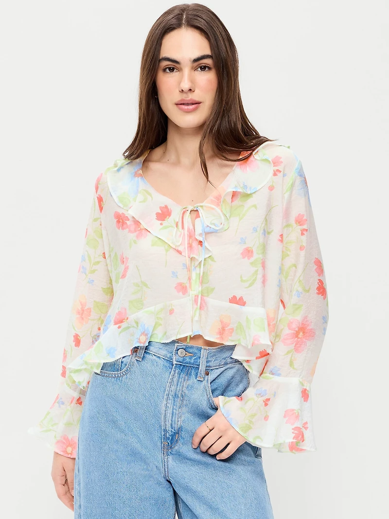 tie-front v-neck ruffle detail at front and hem long bell sleeves
