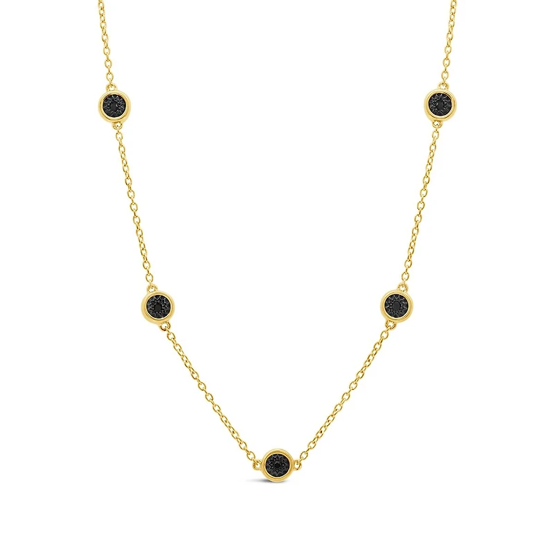 Add a touch of modern sophistication with our Bella Moda 0.10CTW Black Diamond Vermeil Necklace. This elegant piece features bezel-set black diamond stations along a delicate chain, offering a sleek and refined look. Perfect for layering or wearing alone, it brings a bold yet understated shine to any outfit. Vermeil is sterling silver gilded with 10 karat gold or higher.