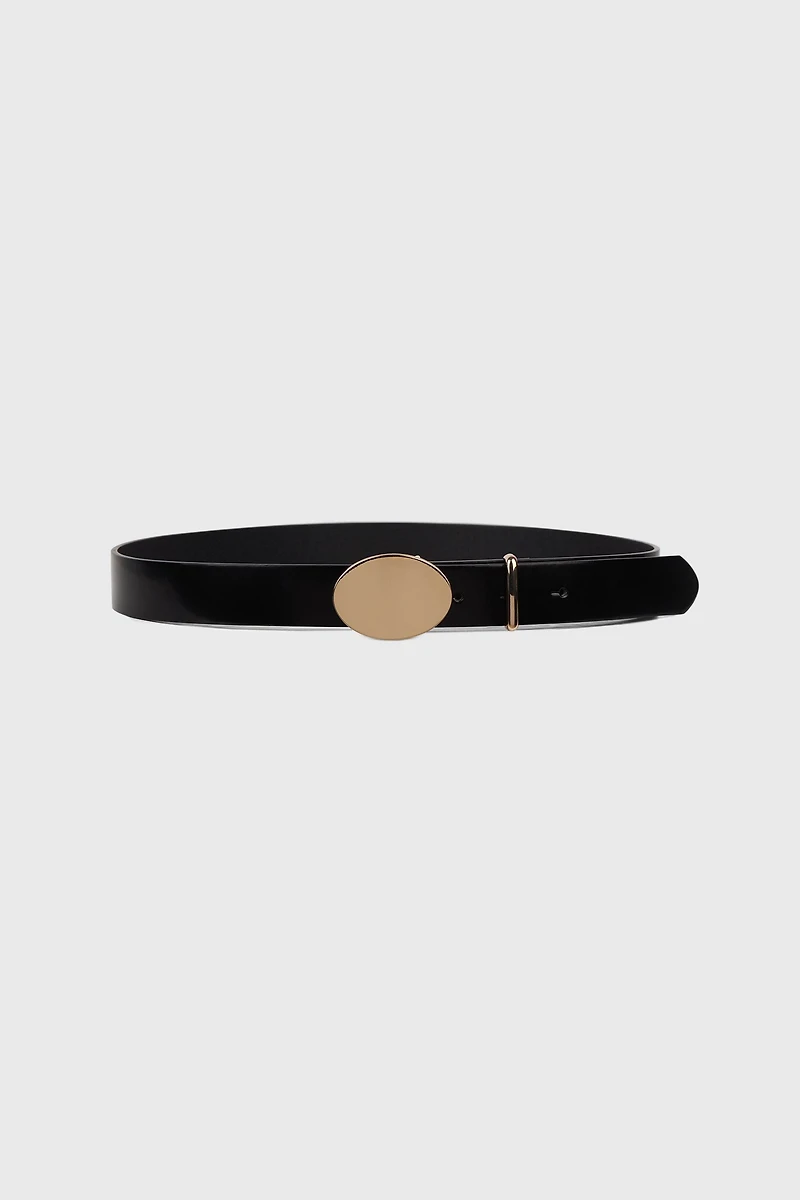 Refined and modern, this belt features a gold rounded buckle that adds a touch of sophistication to any ensemble.
