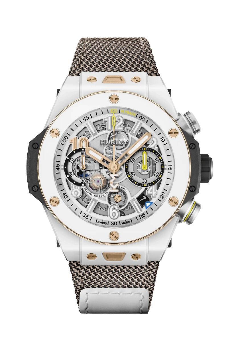 The Big Bang Reloaded Kylian Mbappé is a 200-piece limited edition created with football icon Kylian Mbappé. The 44 mm case combines polished and microblasted white ceramic with an 18K King Gold upper bezel engraved with Mbappé's mantra "Trust Yourself" at 6 o'clock, powered by the HUB1280 UNICO flyback chronograph.