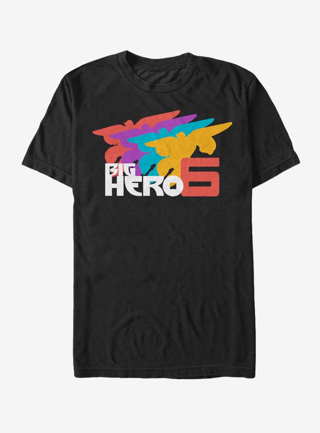 Join Hiro and Baymax on their next adventure with the Big Hero 6 Baymax Flight Black T-Shirt. The outline of Baymax flying is printed in four different colors on the front of this cool men's Big Hero 6 graphic tee. 100% Cotton.