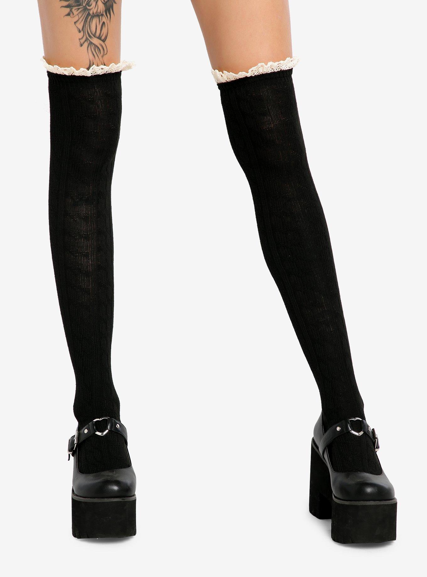 Complete your outfit with these black knit knee-high socks, featuring cream lace trimming up top.