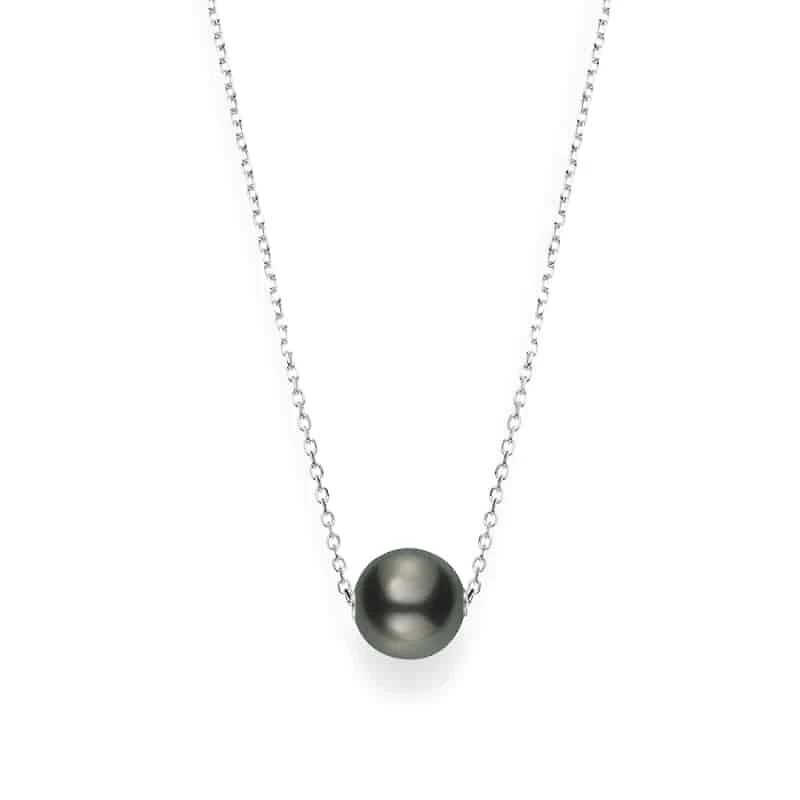 Black South Sea Cultured Pearls are produced by the black-lipped oyster, found only in French Polynesia. This pearl type exhibits a broad spectrum of colors, ranging from black to the rarest color, peacock with an intense iridescent overtone and the highest luster reminiscent of a peacock feather. The simplicity of these pendant designs encapsulates the natural beauty of pearls. A single pearl radiates extraordinarily, that no other gemstones are necessary. 10mm Black South Sea cultured pearl pendant set in 18k white gold.Mikimoto's Black South Sea Cultured Pearls are one of the most sought after in the world and are available in limited quantities.