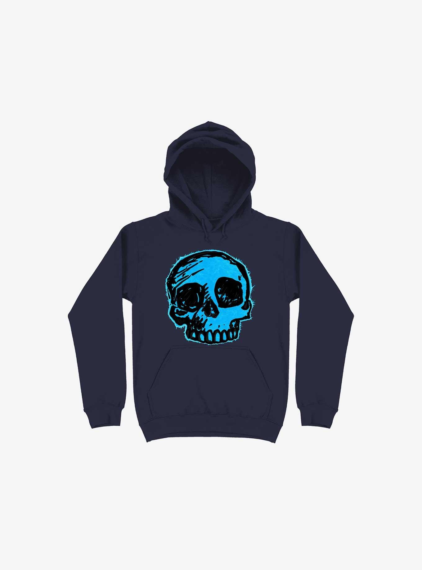 Greet 'em with a grin. This navy blue pullover hoodie features a smiling blue skull. Officially licensed art from Spectral.