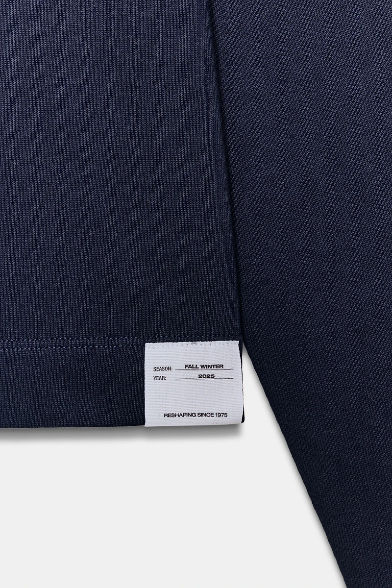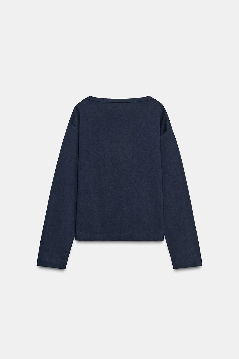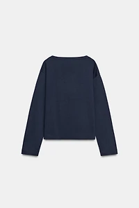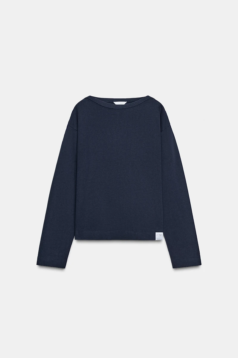 T-shirt made of cotton yarn. Boat neck and long sleeves. Label detail on the front. Straight hem.