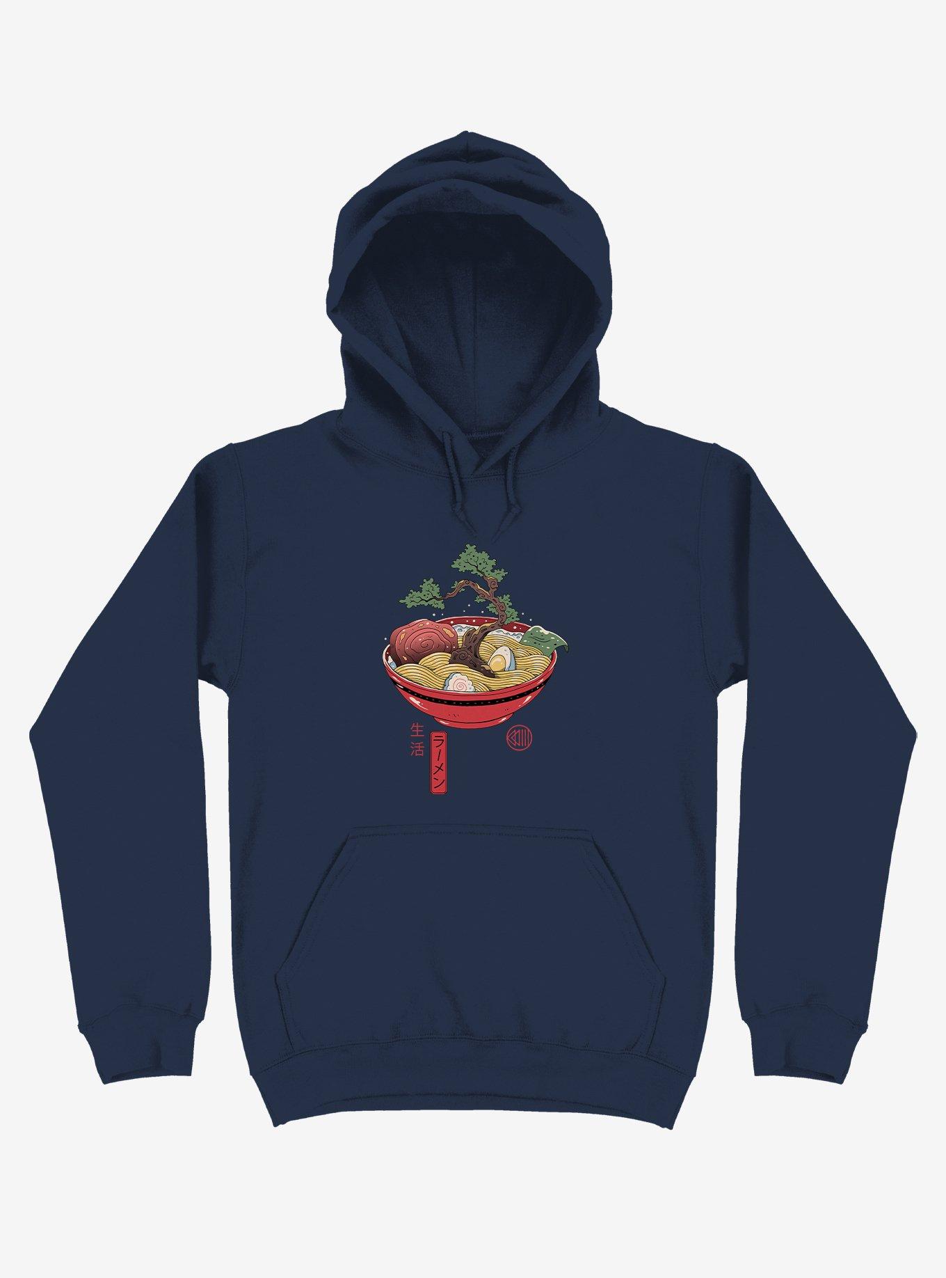 Little tree; big flavor. This navy blue pullover hoodie celebrates the art of bonsai. Wait, or is it just a steamy bowl of ramen? Hmm... why not both?! Officially licensed art from Vincent Trinidad.