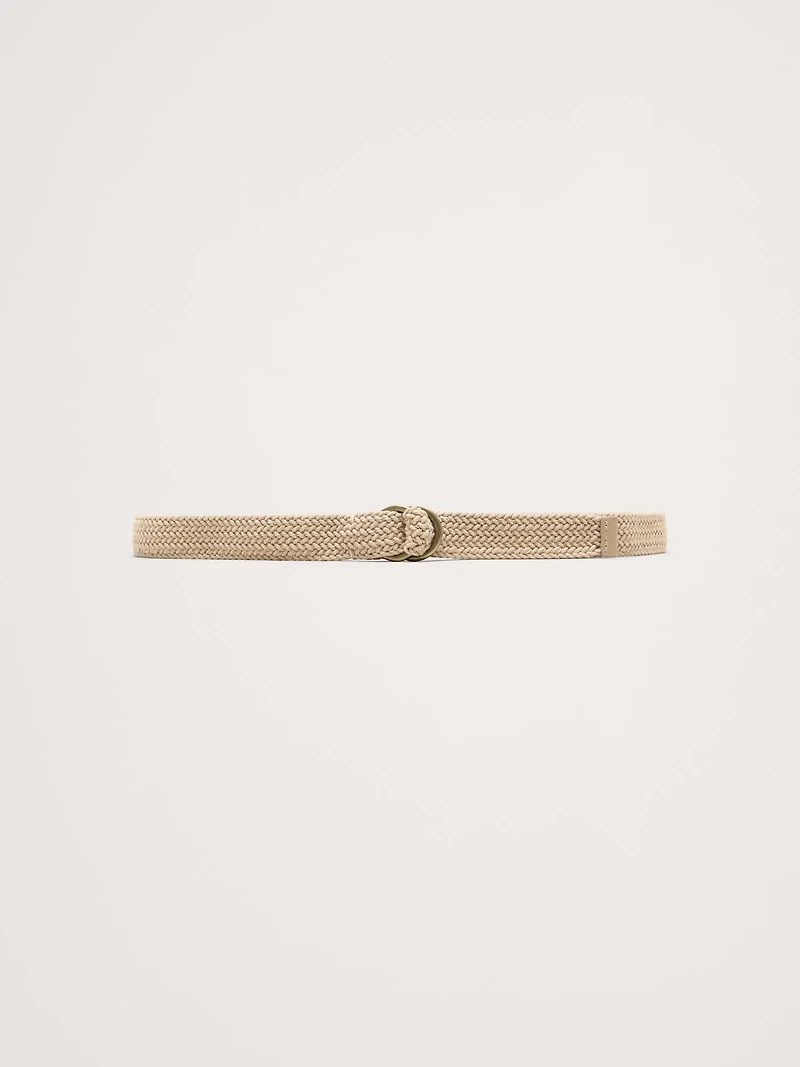 We love a braided belt. This one is braided from strips of sturdy and soft cotton. Pairs well with denim, chinos, and long weekends. Slider buckle. Leather trim.