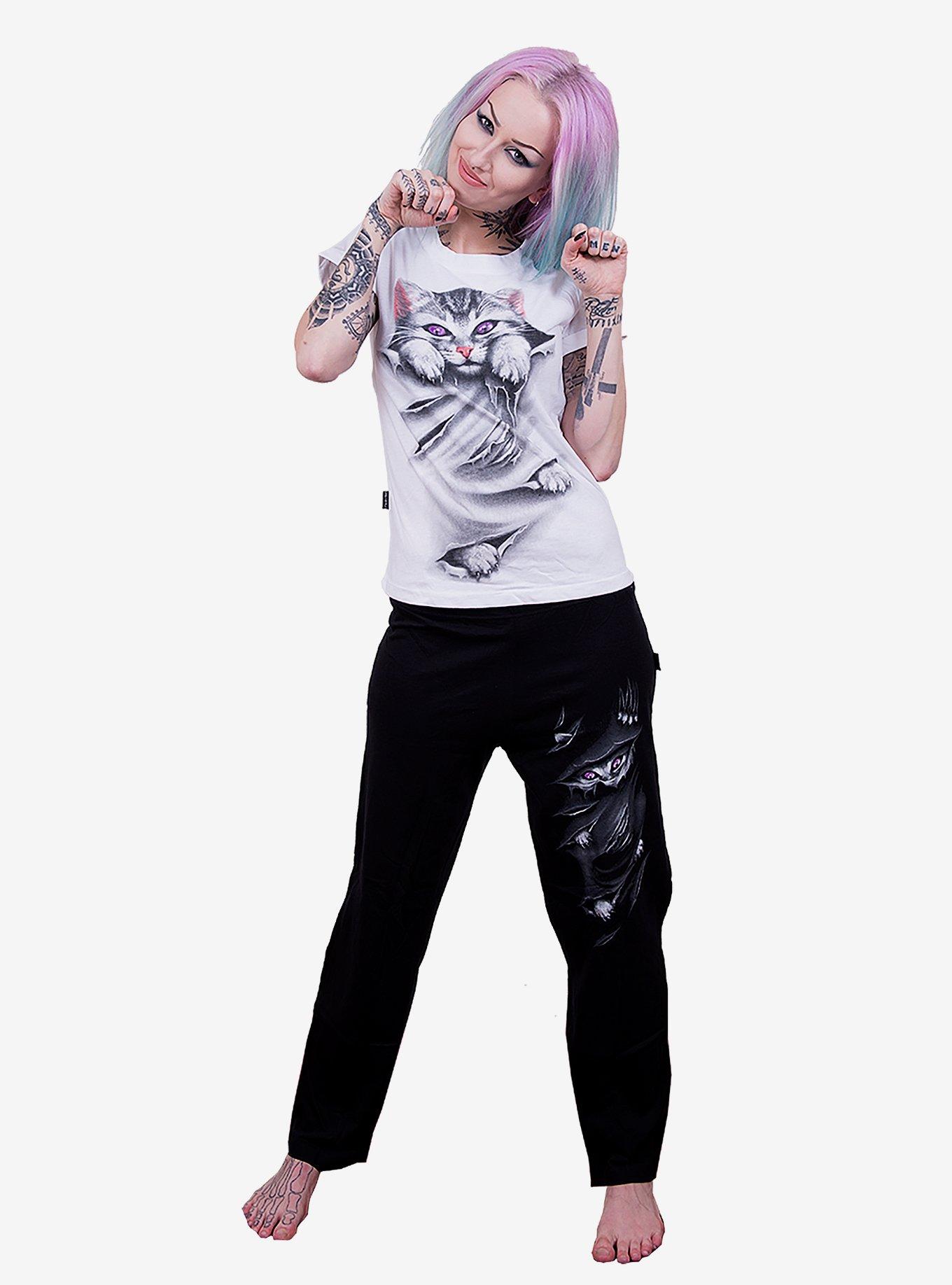 A cute kitten with purple eyes peeks out of the slashed top. This four piece gothic pajama set is made of top quality cotton jersey using skin friendly, Azo-free dyes. Item cannot be shipped to P.O. Boxes